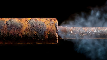 Steam pipe leak with volumetric light. Low angle view of rust flake texture and pressure concept.