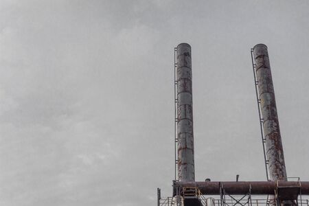 Two rusted metal smokestacks against a dark gray sky, copy space, horizontal aspect