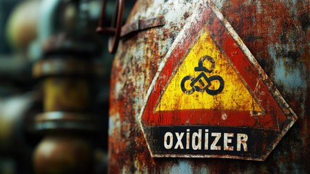 Close-up view of a weathered warning sign indicating oxidizer presence in an industrial setting, highlighting rust and age in hazardous environments.