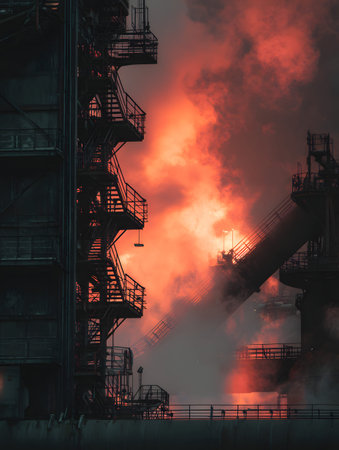 An industrial steel plant exterior with fiery orange steam and metal stairway silhouettes at dusk creating dramatic atmosphere