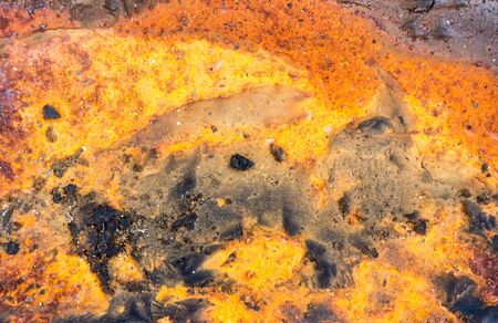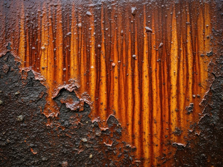 This close-up showcases a metal surface with significant wear and tear. The color palette features a mix of rusty oranges, yellows, and browns. The textured composition reveals the effects of time and environment. This image is suitable for various commercial uses, including website backgrounds and design elements.
