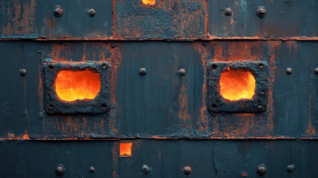 This image depicts a detailed metal surface featuring glowing openings that emit a warm orange light, surrounded by an intricate rusty texture. The striking contrast between the dark metal and the vibrant glow creates a captivating industrial aesthetic, perfect for various creative projects.