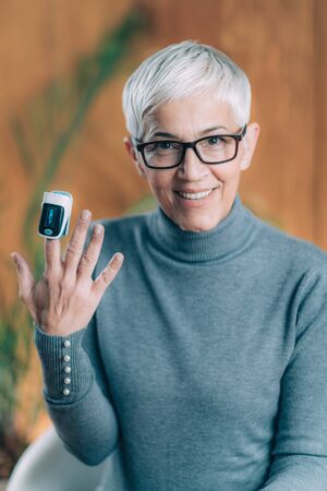 hands of an elderly woman holding a pulse oximeter.measuring oxygen saturation with a pulse oximeter. Health concept.