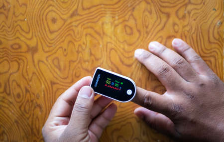 Pulse Oximeter to measure oxygen saturation level in body. Asian male hands puts index finger inside portable oximeter to measure oxygen level.