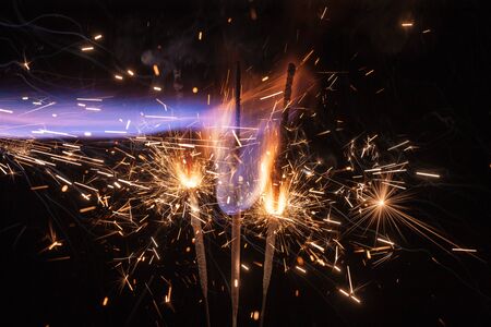 Bokeh lights on black background, shot of flying fire sparks in the air