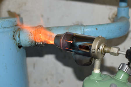 Heating a steel pipe with a blowtorch. The flame of a blowtorch.