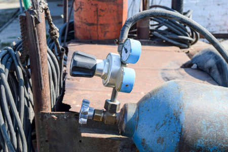 A gas cylinder with nitrogen, a gas reducer and two pressure gauges. flow regulator for reducing gas pressure. selective focus