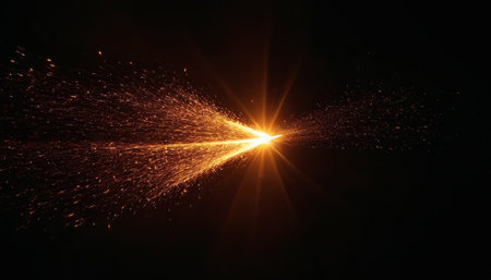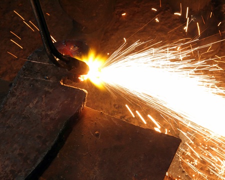 Welding, metal working on dark background, with golden flare and bokeh of sparks