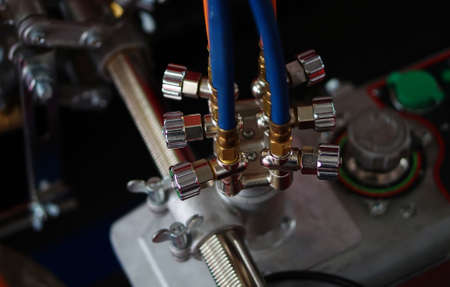 Liquefied gas cylinder with pressure gauges for pressure control is in the industrial shop