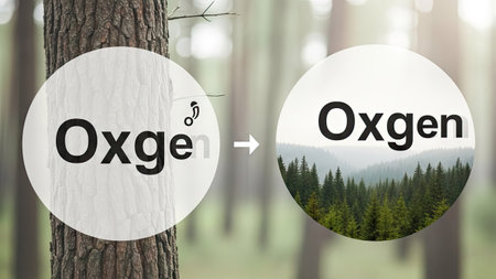 An image presents a visual concept illustrating the transformation of Oxgen to Oxygen. The composition utilizes two circular elements; one displays a stylized font, the other shows a natural scene. The image uses a natural color palette. Suitable for educational content and environmental themes.