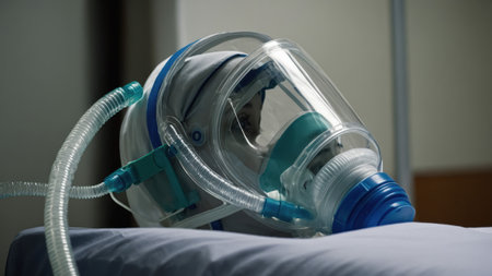 A specialized respiratory mask is positioned on a hospital bed, designed to assist patients with breathing challenges. The device showcases tubes and a clear facepiece, indicating its medical purpose.