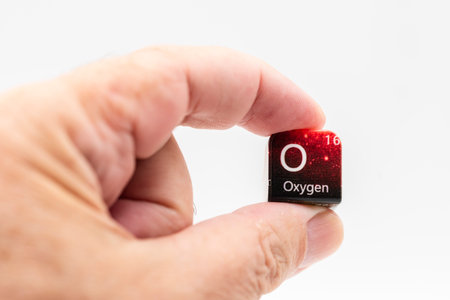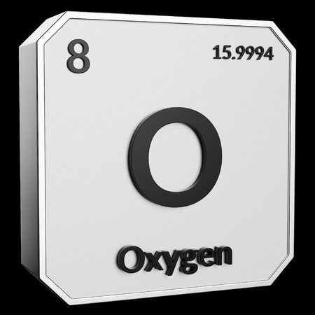 3d text of Chemical Element Oxygen, its atomic weight, periodic number, and symbol on shiny metal geometry with a black background. This image is a 3d render.