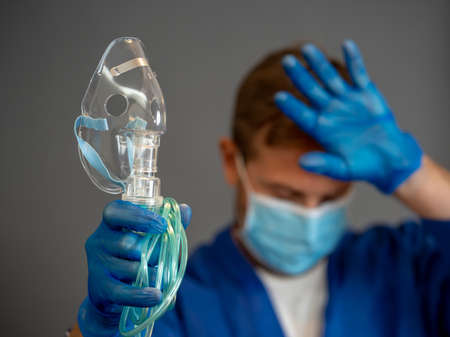 COVID-19 Outbreak. Exhausted Doctor holding non- invasive ventilator. Medical treatment and lack of equipment for coronavirus infected patients with SARS. Shortage of medical ventilators in hospitals.