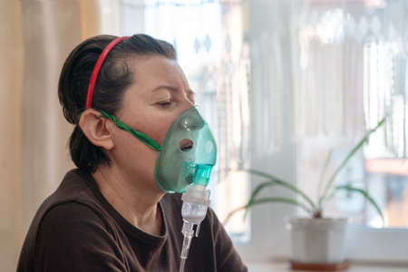 Close-up photo of sick caucasian woman with an inhaler. Unhealthy female doing inhalation at home, Inflammatory lung disease. High quality photo