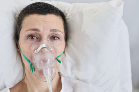 Close-up of senior woman in oxygen mask looking at camera while lying on bed on reanimation