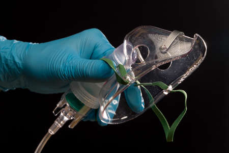 Doctor's hand in medical gloves with disposable oxygen mask for breathing support