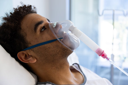 Biracial male patient with oxygen mask lying in bed in sunny hospital room. Medicine, healthcare and medical services, unaltered.