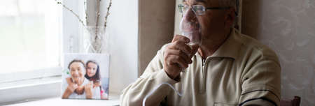 Senior man using medical equipment for inhalation with respiratory mask, nebulizer in the room