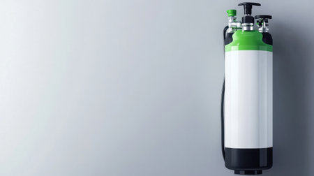 A sleek gas cylinder featuring a vibrant green accent and a blank label on a smooth wall background, perfect for various applications and industries.