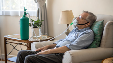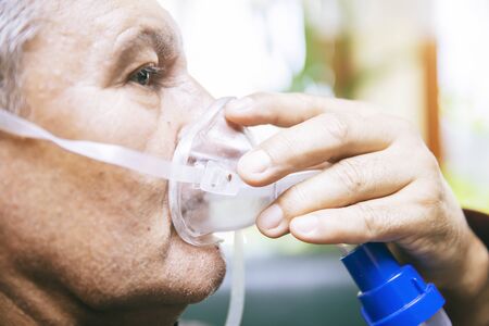 Elderly man using an oxygen mask in the living room at home