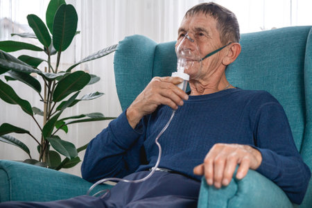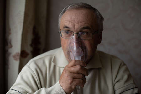 Senior man using medical equipment for inhalation with respiratory mask, nebulizer in the room