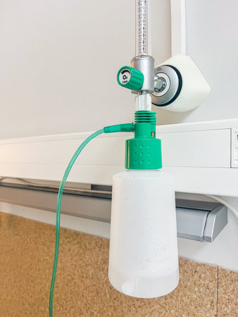Medical oxygen delivery system with green regulator and transparent bottle, highlighting vital equipment for patient care in a clinical setting, emphasizing safety and efficiency