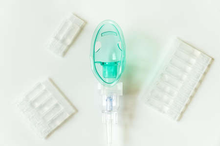 Medical oxygen mask with nebulas isolated on white background. Medical inhaler, nebulizer, nebular. Asthma breathing treatment. Top view