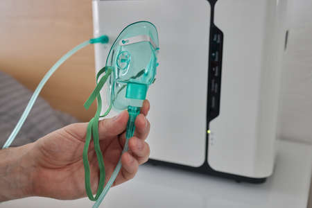 Oxygen therapy, supplemental oxygen. Man inhaling oxygen through nasal cannula attached to concentrator machine. It strengthens immune system and supports faster regeneration of the body.