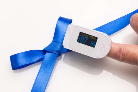 The process of measuring the level of oxygen in the blood. Concept. A pulse device for measuring human oxygen saturation. Decreased oxygenation is a sign of pneumonia. Diagnosis of Covid 19