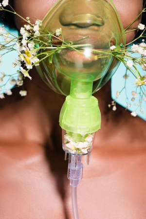 Sick woman doing inhalation using oxygen mask. Unhealthy girl suffer from serious viral illness.
