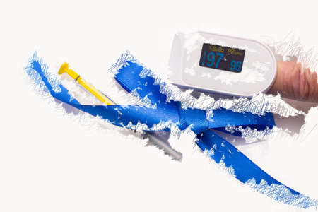 The process of measuring the level of oxygen in the blood. Concept. A pulse device for measuring human oxygen saturation. Decreased oxygenation is a sign of pneumonia. Diagnosis of Covid 19