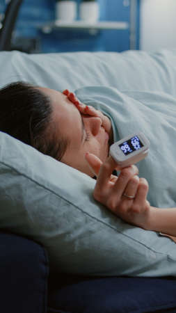 Close up of unwell woman holding oximeter on finger for oxygen saturation measurement and checking pulse pressure while laying on sofa. Person with sickness looking at medical gadget