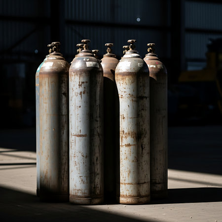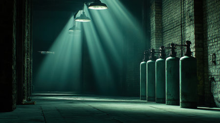 An industrial setting featuring gas cylinders illuminated by soft, dramatic light rays filtering through the space. The shadows create a moody atmosphere.