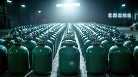 A striking view of green gas cylinders meticulously arranged in a well-lit warehouse, showcasing modern industrial storage and organization principles.