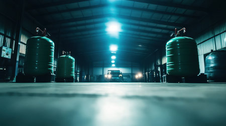 An artistic view of green industrial tanks in a spacious warehouse, featuring dramatic lighting and a tranquil atmosphere. The perspective captures the details of the empty space.