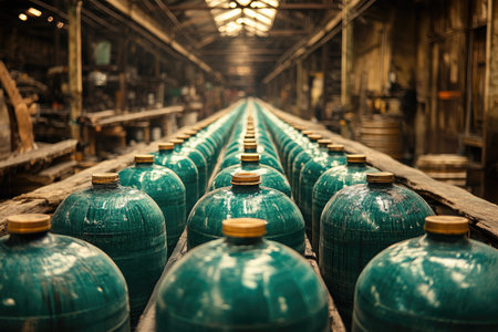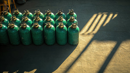 A striking image showcasing a row of green gas cylinders lined up neatly on a textured floor, adorned with soft shadows created by natural light.