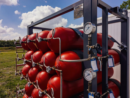 A row of high-pressure green gas cylinders stands ready, connected to a complex manifold system in a clean industrial facility. This setup ensures a continuous and regulated supply for manufacturing or research, symbolizing precision, safety, and industrial power.