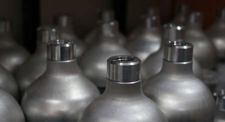 Production of gas cylinders. Cylinders with technical gases. Fragments of an oxygen tank. Tanks for liquid oxygen.