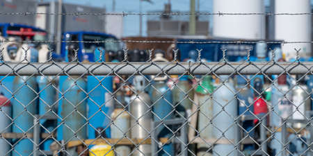 Gas cylinders stored behind wire mesh fence in factory
