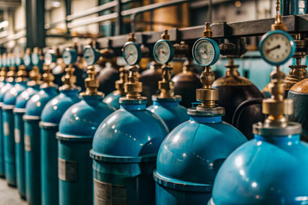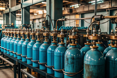industrial gas cylinders aligned in modern manufacturing facility with workers inspecting equipment in spacious production warehouse.
