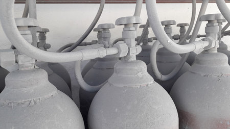 A group of industrial gas cylinders arranged in a rack on the outside of a factory