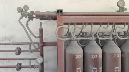 Oxygen and Argon gas storage steel tanks for industry welding process manufacture etc at gas room storage outside factory