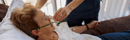 Retired woman with oxygen tube against respiratory problem in hospital ward bed. Sick patient breathing heavily while resting and waiting for medical assistance with IV drip bag.