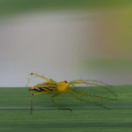 A yellow spider or Oxyopes salticus, lynx spider, Commonly known as the striped lynx spider on a green leaf, Macro photo of insect with selective focus.