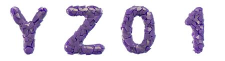 Plastic letters set Y, Z, 0, 1 made of 3d render plastic shards purple color. Collection of plastic alphabet isolated on white.