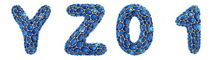 Realistic 3D letters set Y, Z, 0, 1 made of gold shining metal letters. Collection of gold shining metallic with blue paint symbol isolated on white background
