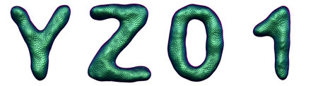 Letter set Y, Z, 0, 1 made of realistic 3d render natural green snake skin texture. Collection of snake skin texture with green color symbol isolated on white background
