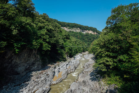 Mountain landscape with a river flowing through the gorge on a sunny day