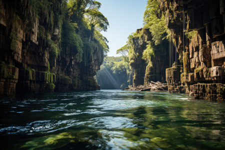 An aerial view of a river running through a canyon. Generative AI image.