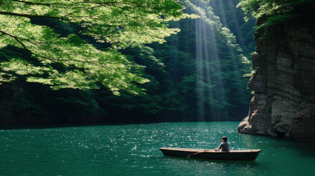 A lone person paddles a small boat on a serene, turquoise river. Dramatic sun rays filter through the lush green trees of a steep, rocky gorge, creating a peaceful scene.
